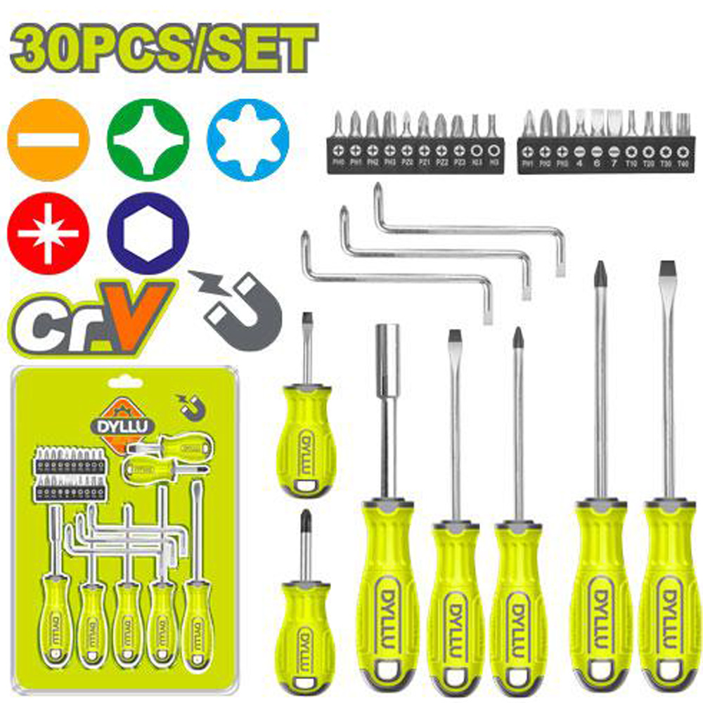 ست ۳۰ عددی پیچ‌گوشتی دایلو مدل DTSS1430 | ابزار حرفه‌ای و کامل، یک مجموعه کامل و حرفه‌ای برای انواع کاربردهای خانگی و صنعتی است. این پک شامل انواع سری‌ پیچ‌گوشتی، پیچ‌گوشتی‌های دوطرفه، مغناطیسی و دسته‌دار است که از فولاد مقاوم CR-V ساخته شده‌اند.