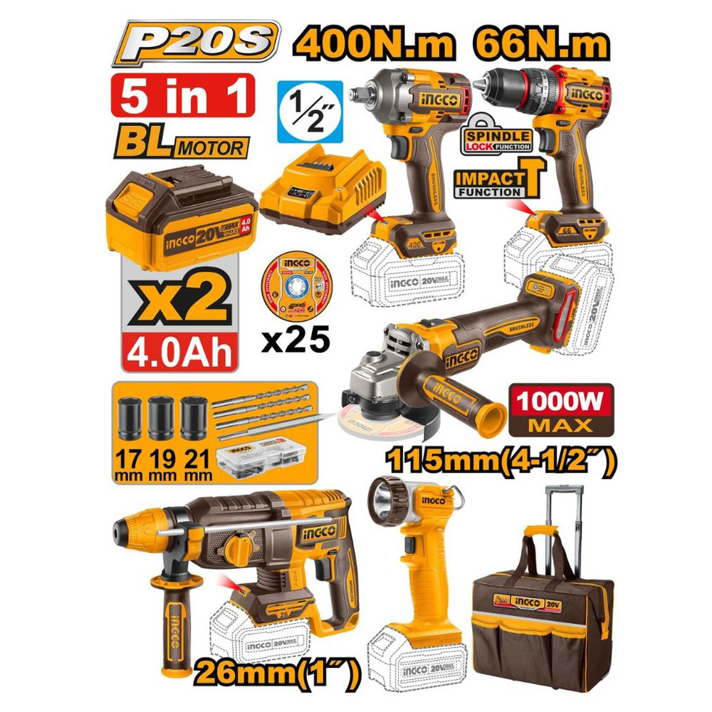 پک شارژی ۵ عددی ۲۰ ولت سوپر اینکو سری حرفهای مدل CKLI2059 شامل ۵ ابزار قدرتمند و پرکاربرد است که با باتریهای لیتیومیون ۲۰ ولت، شما را در کارگاه، منزل یا محل کار همراهی میکند. این مجموعه با طراحی ارگونومیک و موتورهای براشلس، هم طول عمر بیشتری دارد و هم قدرت بالاتری در اختیار شما قرار میدهد.